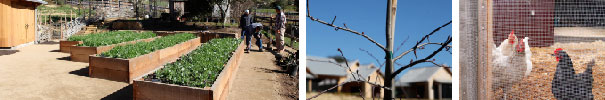 Fruit trees and berries with specific varieties and three/four-in-one multi-grafted trees to create an extended harvest from June through October. Using semi-dwarf and dwarf rootstocks for easy harvest for children without the use of ladders or poles. All fruit trees are mulched for water conservation and weed management.